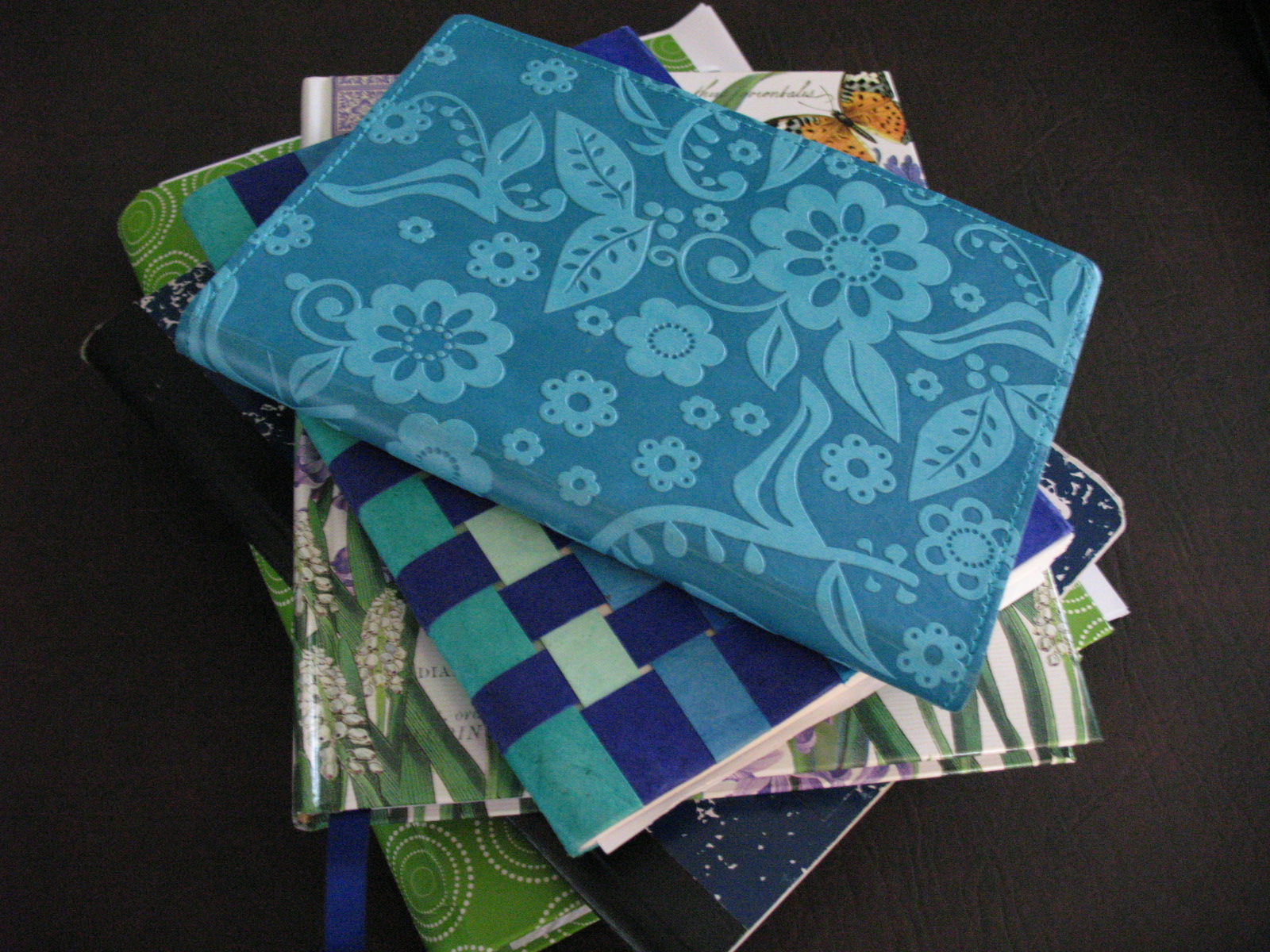 I've been using these pretty notebooks and journals and diaries to help me plan. I am an avid diary keeper, but more on that later. This particular stack is (from bottom) my design notebook (in which I try to take notes as I work on a design so as not to completely forget all those sniggy details), my journal (in which I write out my angers and sorrows instead of blurting them out to everyone...and occasionally make planning notes and sketches in the margins), my diary (see note to previous item), my sketchbook, and on top is my business weekly log. The last couple of months last year I wrote out a plan that took in several weeks at a time (like I did in grad school, which my mom referred to in her comment on a post I so bravely wrote about said faulty plan), but this year I am only writing large goals on one list and filling in one week at a time in accordance with those goals. Whew. Wish me luck. It's working better so far!